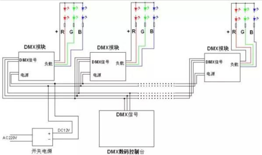 DMX512控制系統(tǒng)示意:若干臺RGB燈具,每一臺燈具內(nèi)部都包含1個DMX模塊,該模塊在同時接收到了電源供電和控制器信號的情況下,才會驅(qū)動LED燈珠亮暗變化,從而來調(diào)節(jié)顏色的變化。