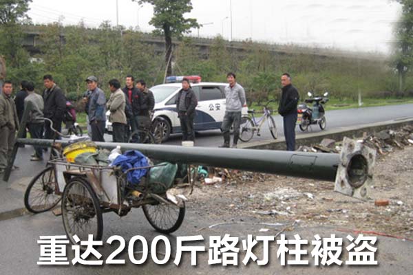 次年2010年3月,杭州濱江路上一男子用自己腳踏三輪車承載著正準(zhǔn)備安裝的6米路燈燈柱,該燈柱重達(dá)200斤。幸好被周邊民眾圍堵后攔下來,隨后民警趕到現(xiàn)場(chǎng)。