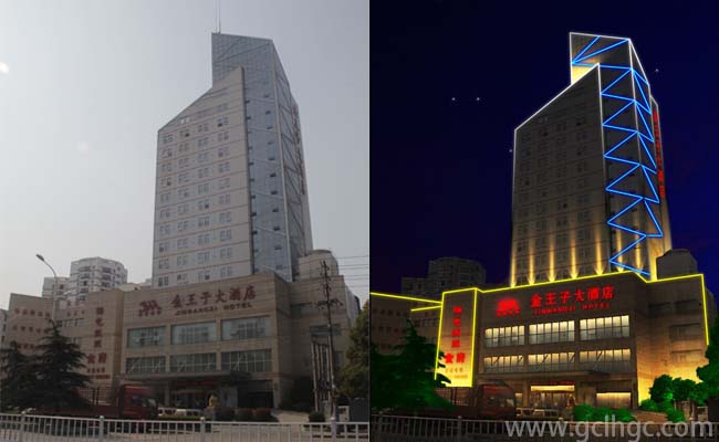 金王子大酒店作為當(dāng)?shù)氐囊蛔貥?biāo)性建筑,酒店方對(duì)亮化這一塊非常重視,亮化方案不能太過(guò)于浮夸、手法不能太重、耗電不能過(guò)大等等,施工方肖總也是方案改了一次又一次,關(guān)于耗電這個(gè)問(wèn)題也就意味著布燈的數(shù)量不能多,盡量少。但是燈具少了布燈的方案要配合好,不然會(huì)影響整體效果。