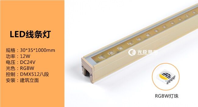 A、B雙子大樓夜景亮化主要以全彩線條燈做屏的形式,采用DMX512八段RGBW線條燈,合計一萬多米,縱向安裝。為了白天更好的隱蔽性和裝飾性,燈體外殼做幕墻顏色噴涂處理,以米黃色PU膠灌封防水。