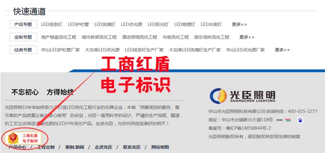 大看可以通過(guò)這個(gè)標(biāo)識(shí)去了解該公司的資質(zhì),紅盾電子標(biāo)識(shí)一般會(huì)安裝在網(wǎng)站的底部位置,這也是您找線(xiàn)條燈廠家的一種標(biāo)準(zhǔn)之一哦,光臣照明從網(wǎng)站建站開(kāi)始已取得紅盾電子標(biāo)識(shí),您可以通過(guò)官方網(wǎng)站首頁(yè)底部查看。