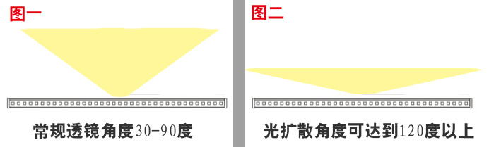 我們用兩張圖讓大家看個明白,LED線條燈為什么要選用光擴散透鏡。如上圖,圖一比喻成我們常規(guī)的LED線條燈透鏡的發(fā)光模式,圖二比喻成我們加蓋了光擴散透鏡的發(fā)光模式,從兩張圖片的對比當中我們能清楚的知道,光擴散的作用是把光束往左右兩邊伸展以達到無暗區(qū)的亮化效果。